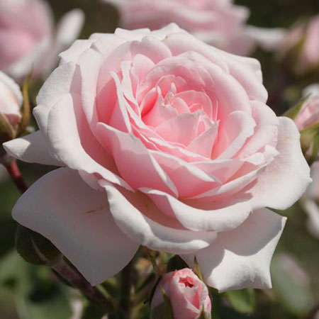Diadem(R). Селекция: Tantau Германия, 1986. Цвет: нежно-розовый. Кол-во цветков на стебле: 3-5. Аромат: слабый. Размер цветка: 6-7 см. Высота: 120-150 см. Ширина: 120 см. Устойчивость к заболеваниям: мучнистая роса ++, черная пятнистость ++. Цветение: повторноцветущая.